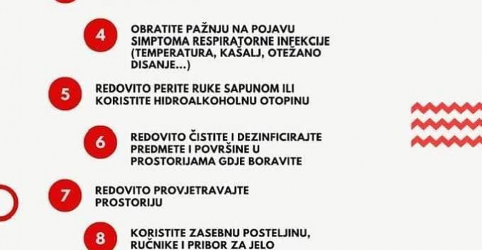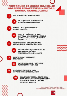 Objavljeno Uto, 17/03/2020 - 09:30 Datum 03/17/2020 - 08:45 U Krapinsko-zagorskoj županiji trenutno su 273 osobe u samoizolaciji. Iako je većina disciplinirana, ima i onih koji ne poštuju odredbe samoizolacije i na taj način ugrožavaju zdravlje svojih sugrađana. Donosimo preporuke za osobe kojima je određen zdravstveni nadzor u kućnoj samoizolaciji koje je objavilo Ministarstvo zdravstva. 1. Nije dozvoljeno izlaziti iz kuće. 2. Svakodnevno kontaktirajte nadležnog epidemiologa. 3. Mjerite tjelesnu temperaturu ujutro i navečer. 4. Obratite pažnju na pojavu simptoma respiratorne infekcije (temperatura, kašalj, otežano disanje...). 5. Redovito perite ruke sapunom ili koristite hidroalkoholnu otopinu. 6. Redovito čistiti i dezinficirajte predmete i površine u prostorijama gdje boravite. 7. Redovito provjetravajte prostoriju. 8. Koristite zasebnu posteljinu, ručnike i pribor za jelo. 9. Osigurajte odvojenu sobu i odvojeno koristite kupaonicu. 10. U slučaju potrebe za odlaskom u zdravstvenu ustanovu prethodno se javite telefonom liječniku obiteljske medicine. Inače, za sve one koji se ne pridržavaju samoizolacije kazne su drakonske. Izvršenje naplate tako izrečene novčane kazne izvršit će se prisilnim putem FINA-e. Brojevi dežurnih epidemioloza u Krapinsko-zagorskoj županiji: 099 245 55 45; 091 730 79 13; 091 510 31 65. PrethodnaSljedeći Tags koronavirus Novosti